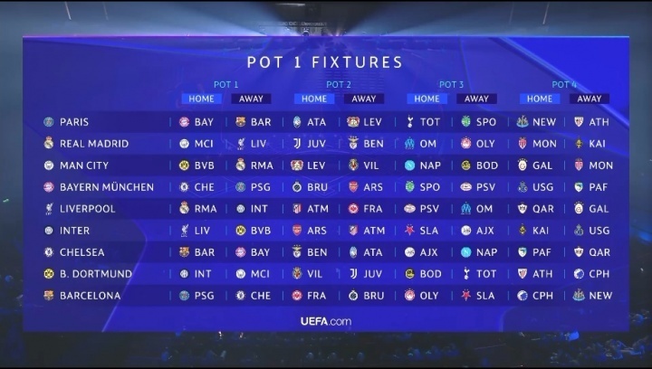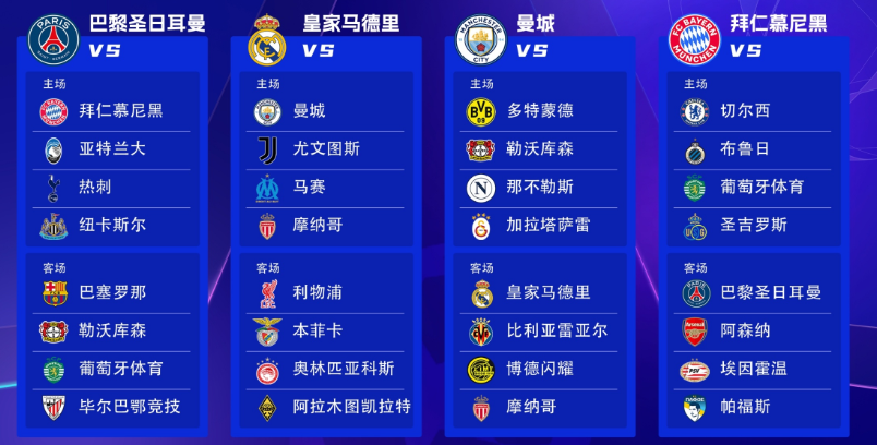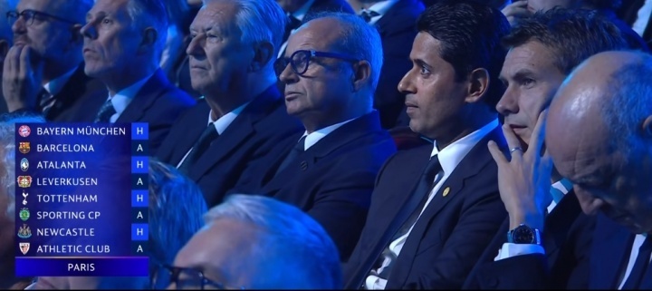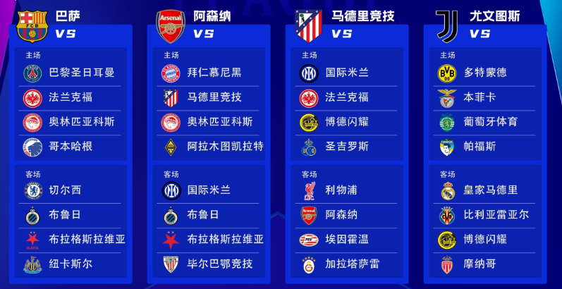 按照这几个赛季的战绩划分,第一档次的球队总共包括了巴黎、皇马、曼城、拜仁、利物浦、国米、蓝军、多特、巴萨这几支队伍。其中,新科欧冠冠军巴黎可是被“安排上了”,比赛难度堪称是淘汰赛级别。从第一战主场VS拜仁开始,接下来分别是对巴萨(只标注客场,A-away,下同)、亚特兰大、勒沃库森(A)、热刺、葡萄牙体育(A)、纽卡、毕尔巴鄂(A)。应当说,整体上是无弱旅状态,这也是对他们极大的检验。